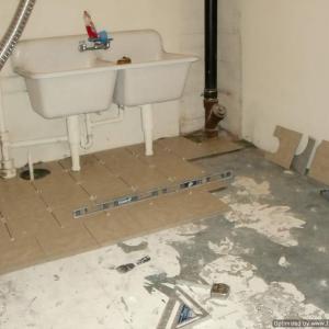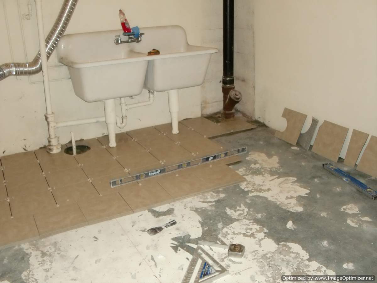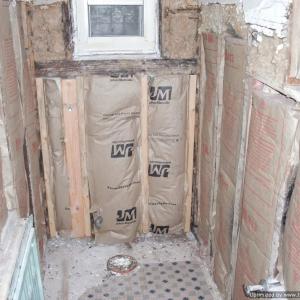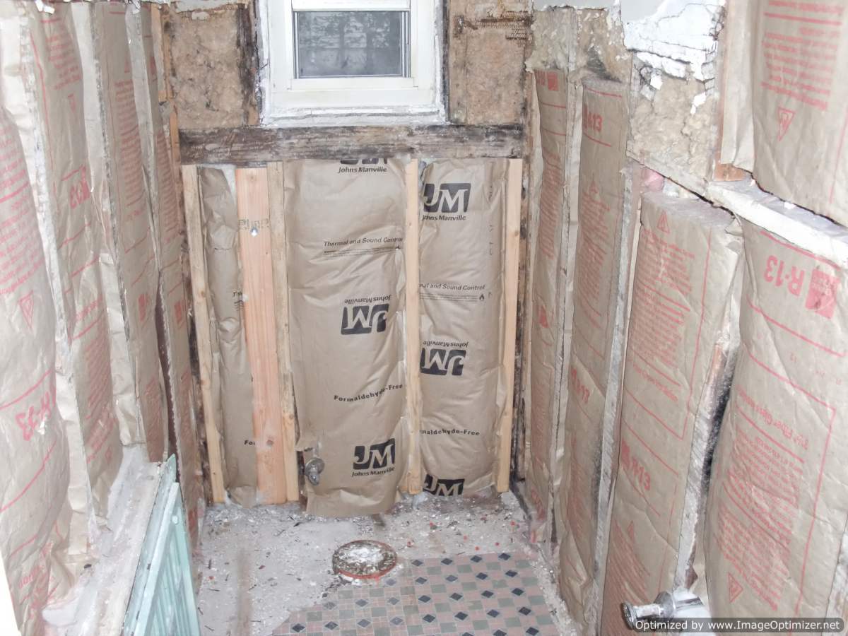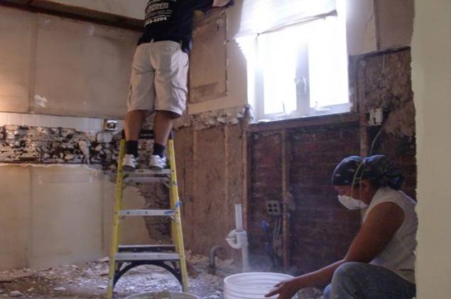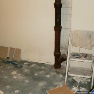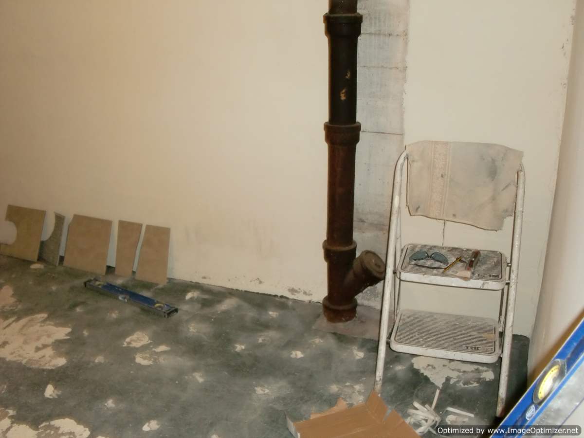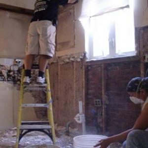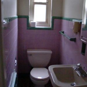 Before, during, and after photos of remodeling work on a very dated bathroom. Our services included removal of old tile, bathroom sink and toliet, plaster walls, flooring, and light fixures. We upgraded the plumbing and electricity, installed new tile flooring, walls, toliet, vanity, walls, and lighting fixtures.