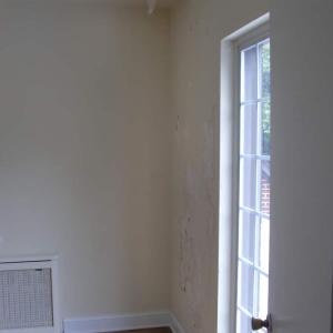 Before and after photos of the replacement of a window and severely water damaged plaster. Drywall was installed on the walls and the window was replaced with new storm and 15-light doors.
